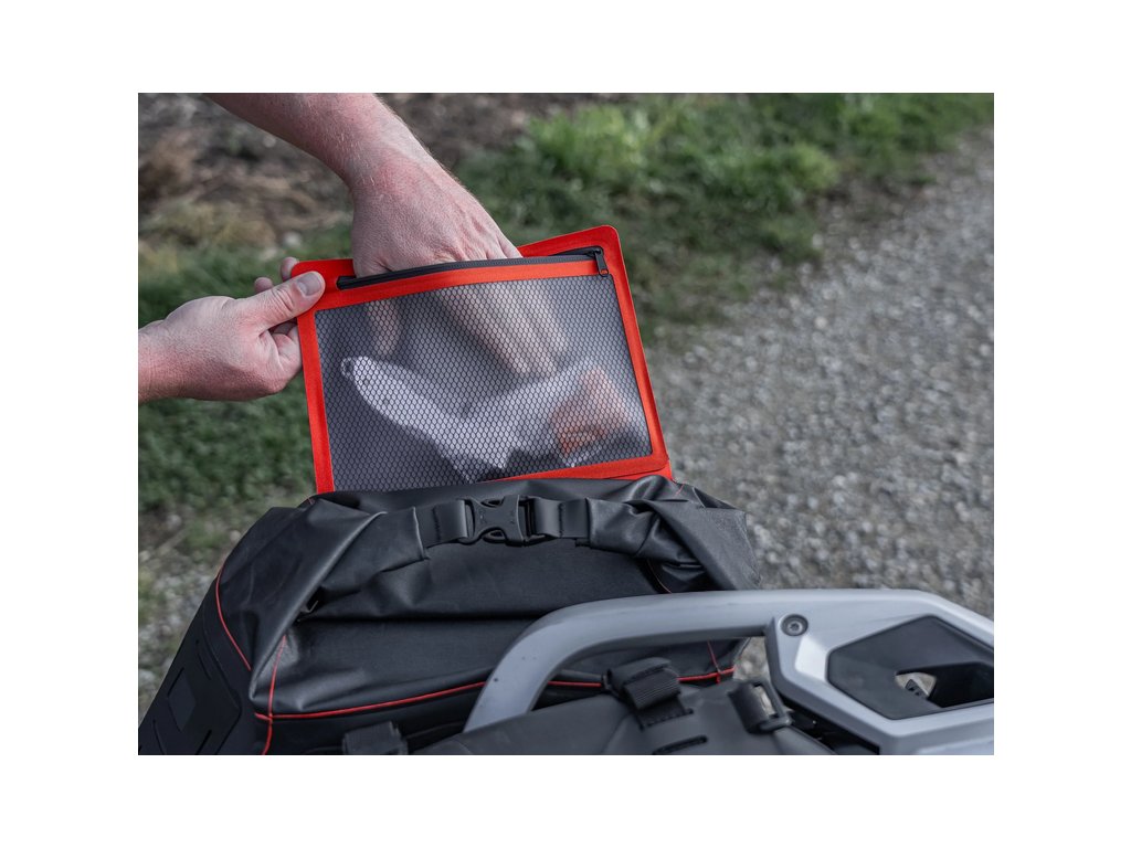 Każda sakwa ma jeden Attachment Pad na klapie, który dodatkowo chroni zwijany system zamknięcia. Pod tą klapą znajduje się mała kieszeń na zamek po jednej stronie, idealna do przechowywania dokumentów lub drobnych przedmiotów. Po drugiej stronie znajdują się dwie elastyczne taśmy, idealne do przechowywania dodatkowych rękawic, lekkiej kurtki przeciwdeszczowej lub innych przedmiotów, które chcesz mieć szybko pod ręką.