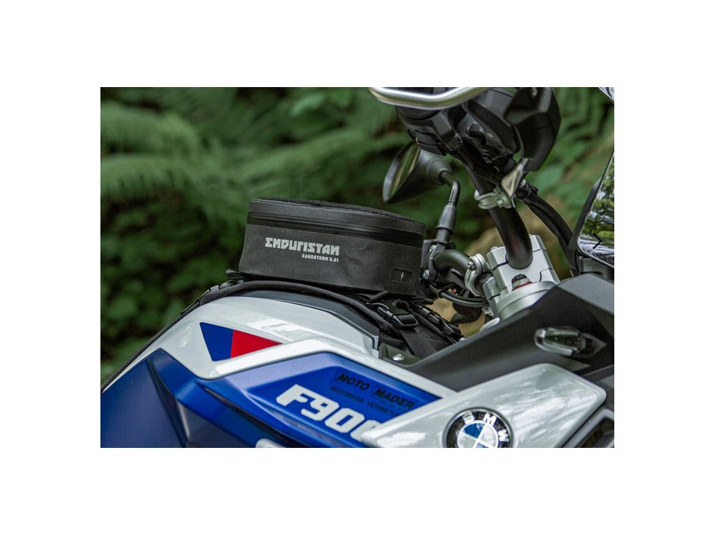Torby na zbiornik Sandstorm 5 można bezpiecznie przymocować do motocykla. Mocuje się je z przodu za pomocą paska, który pozostaje na motocyklu nawet po zdjęciu torby na zbiornik. Tył jest zabezpieczony paskami z wbudowanymi paskami ROKstraps, które są przymocowane do ramy za pomocą klamer, umożliwiając regulację długości, aby idealnie dopasować je do motocykla.