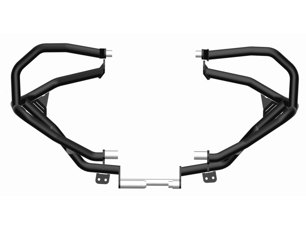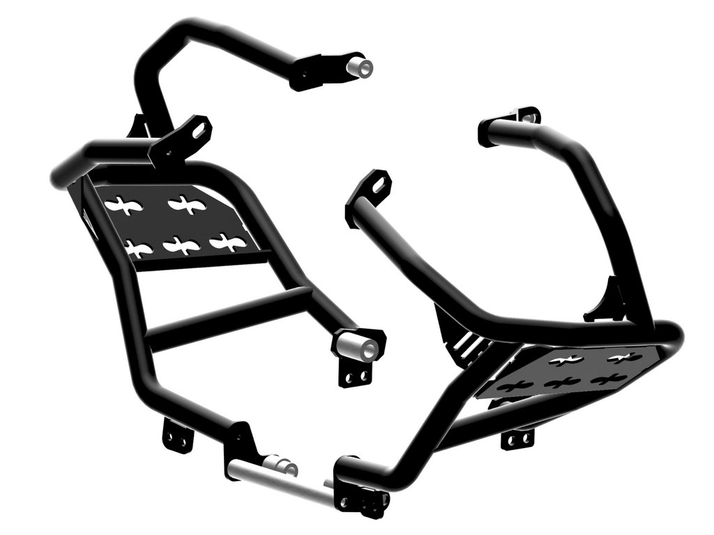 - Solidne punkty mocowania – żadnych kompromisów! Elementy wycinane laserowo dla idealnego dopasowania, wykonane z 5-milimetrowej stali. Te części przejmują energię uderzeń przy wywrotkach zamiast ramy motocykla.