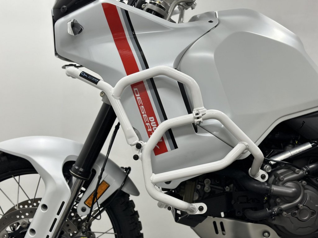 Pełny zestaw Crash Bars dla Ducati DesertX daje mu ochronę, której wymaga w przypadku jakichkolwiek wstrząsów na asfalcie, a także gdy zdecydujesz się na dalszą eksplorację poza nim. Baw się dobrze na swoim motocyklu, wiedząc, że zbiornik i wszystkie plastikowe części motocykla są znacznie bezpieczniejsze. Ewentualne uszkodzenia całego przodu motocykla (owiewek, zbiornika, zawieszenia, a nawet reflektorów, kierunkowskazów i chłodnicy) zostaną znacznie zminimalizowane.
