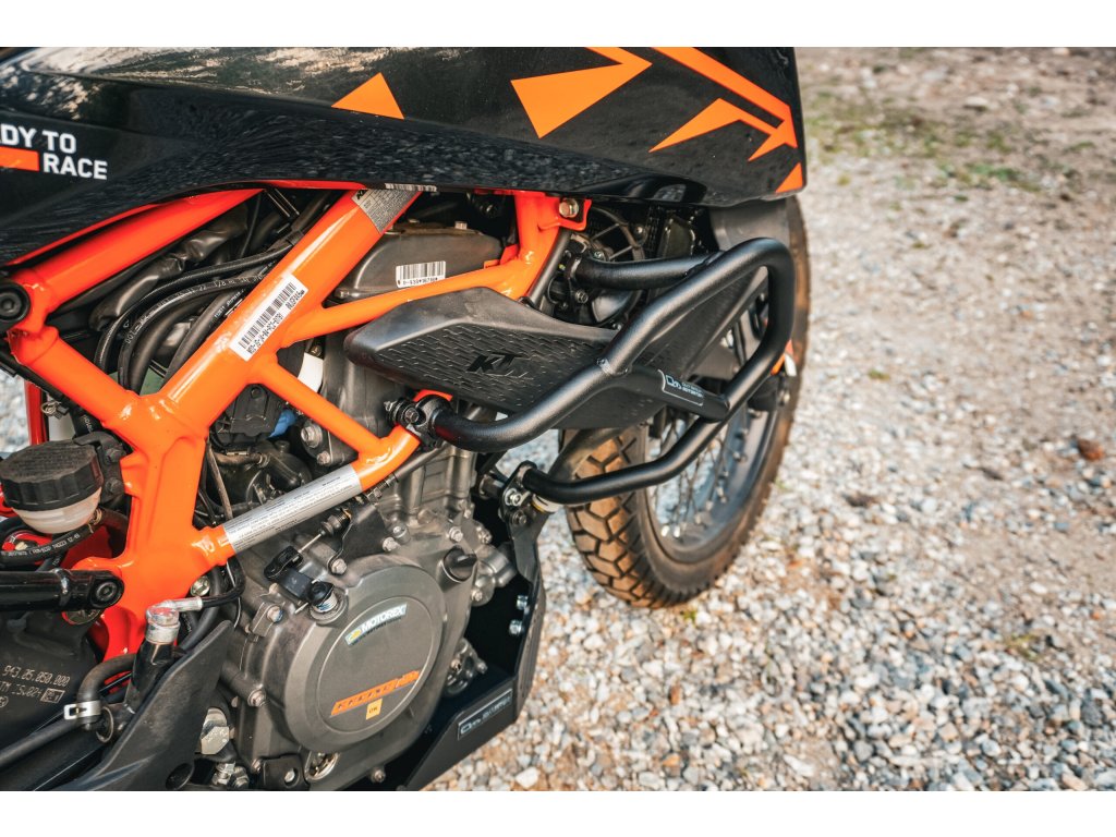 Konstrukcja gmoli do motocykla KTM 390 Adventure opiera się na filozofii, że mniej często znaczy więcej, dlatego stworzyliśmy kompaktowy, solidny zestaw gmoli, które nie sięgają daleko od punktów mocowania. Nasze gmole są montowane wyłącznie na ramie.