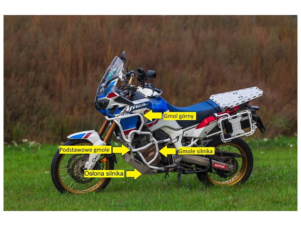 Poszerzenie podstawowych gmoli o ochronę silnika nowego modelu Africa Twin z manualną lub automatyczną skrzynią biegów DCT. Instalacja jest możliwa tylko wraz z gmolami Outback Motortek