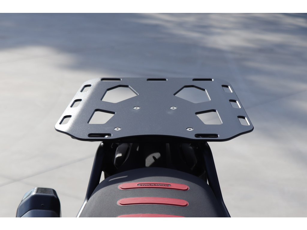 Szeroka aluminiowa płyta BUMOT do mocowania bagażu BMW F900 GS. Dzięki otworom na obwodzie można na niej zamocować dowolne miękkie bagaże. Zaokrąglone rogi płyty zapobiegają uszkodzeniu pasków. Zestaw zawiera tylny stelaż dedykowany do BMW F900 GS.