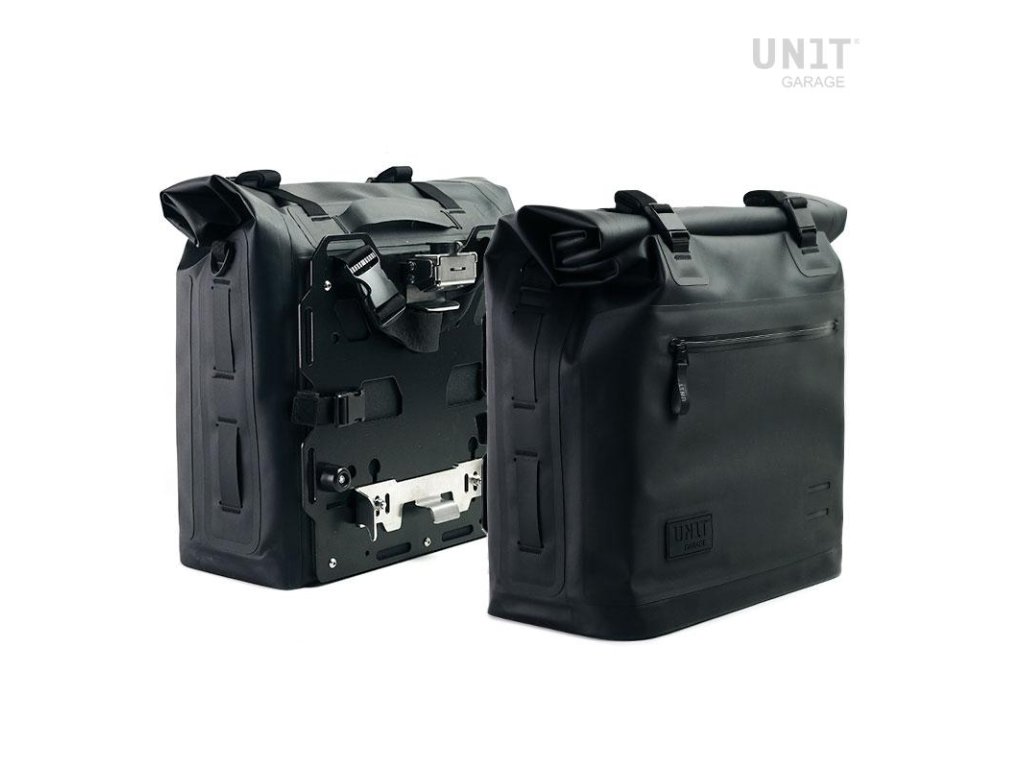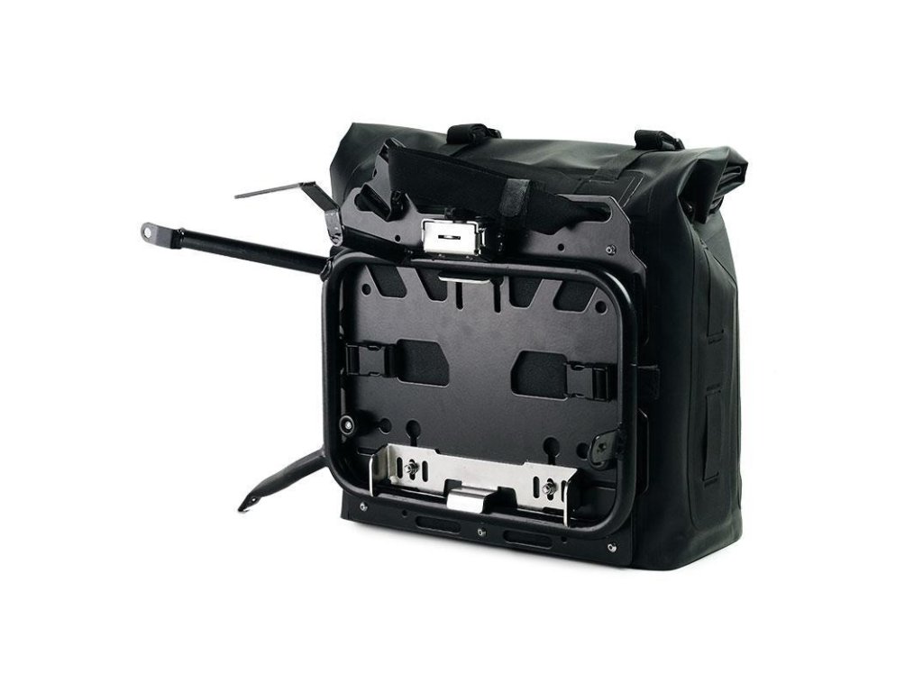 W zestawie znajdują się dwie boczne sakwy Khali wykonane z najwyższej jakości TPU z wykończeniem Hypalon, wraz z aluminiową tylną płytą i zintegrowanym systemem szybkiego mocowania z blokadą.