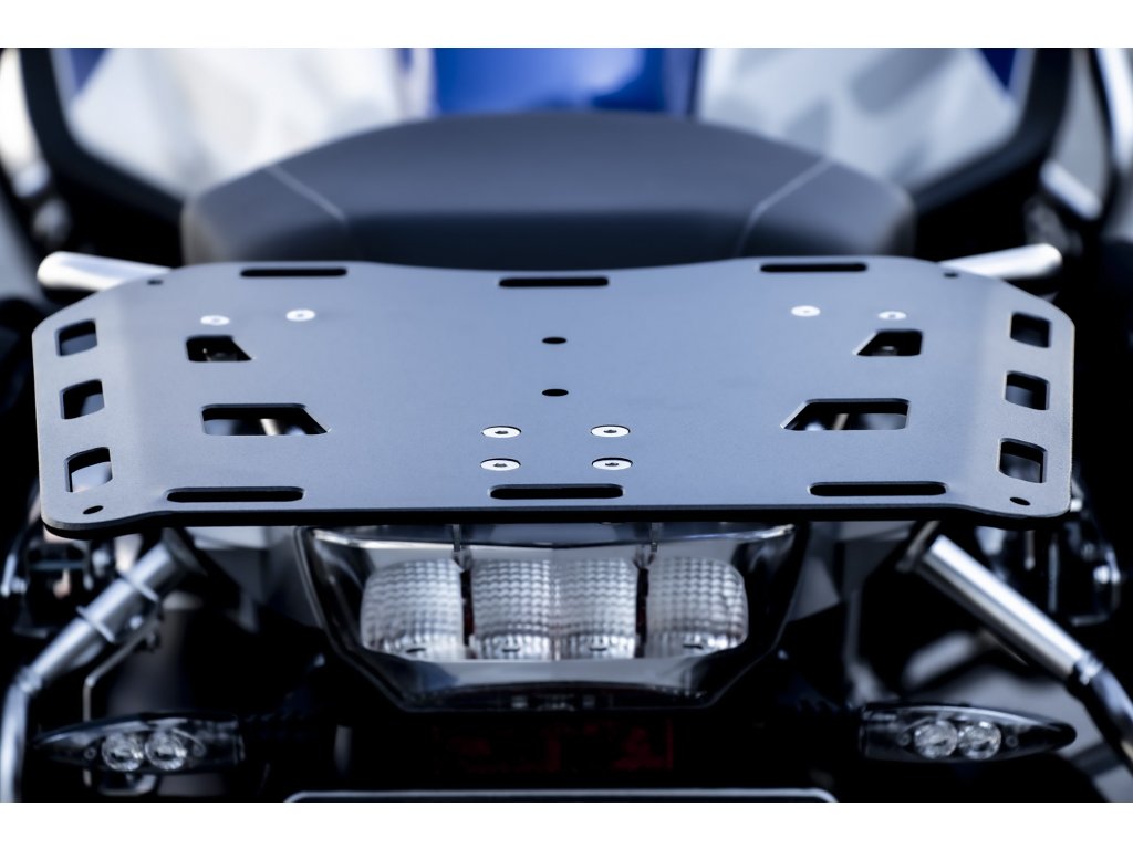 Szeroka aluminiowa płyta BUMOT do mocowania bagażu na BMW R1250 GSA. Dzięki otworom na obwodzie można na niej zamocować dowolne miękkie bagaże. Zaokrąglone rogi płyty zapobiegają uszkodzeniu pasków.