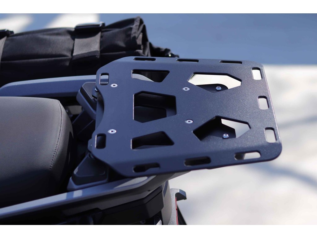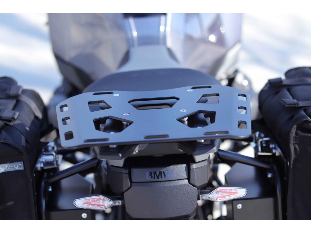 Szeroka aluminiowa płyta BUMOT do mocowania bagażu na BMW R1300 GS Adventure. Dzięki otworom na obwodzie można na niej zamocować dowolne miękkie bagaże. Zaokrąglone rogi płyty zapobiegają uszkodzeniu pasków.