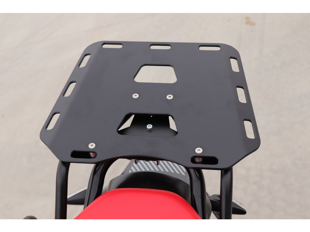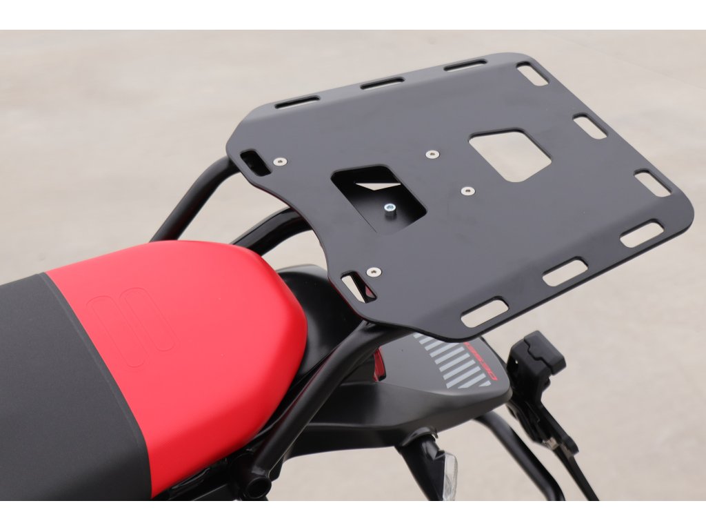 Szeroka aluminiowa płyta BUMOT do mocowania bagażu na Ducati Desert X. Dzięki otworom na obwodzie można na niej zamocować dowolne miękkie bagaże. Zaokrąglone rogi płyty zapobiegają uszkodzeniu pasków.
