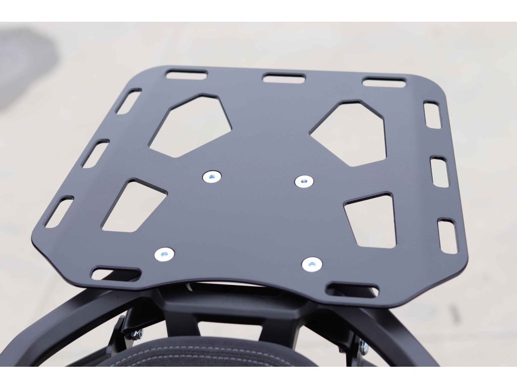 Szeroka aluminiowa płyta BUMOT do mocowania bagażu na Moto Guzzi Stelvio. Dzięki otworom na obwodzie można na niej zamocować dowolne miękkie bagaże. Zaokrąglone rogi płyty zapobiegają uszkodzeniu pasków.