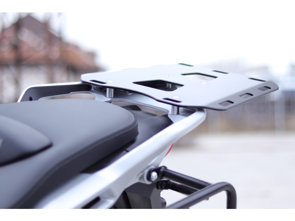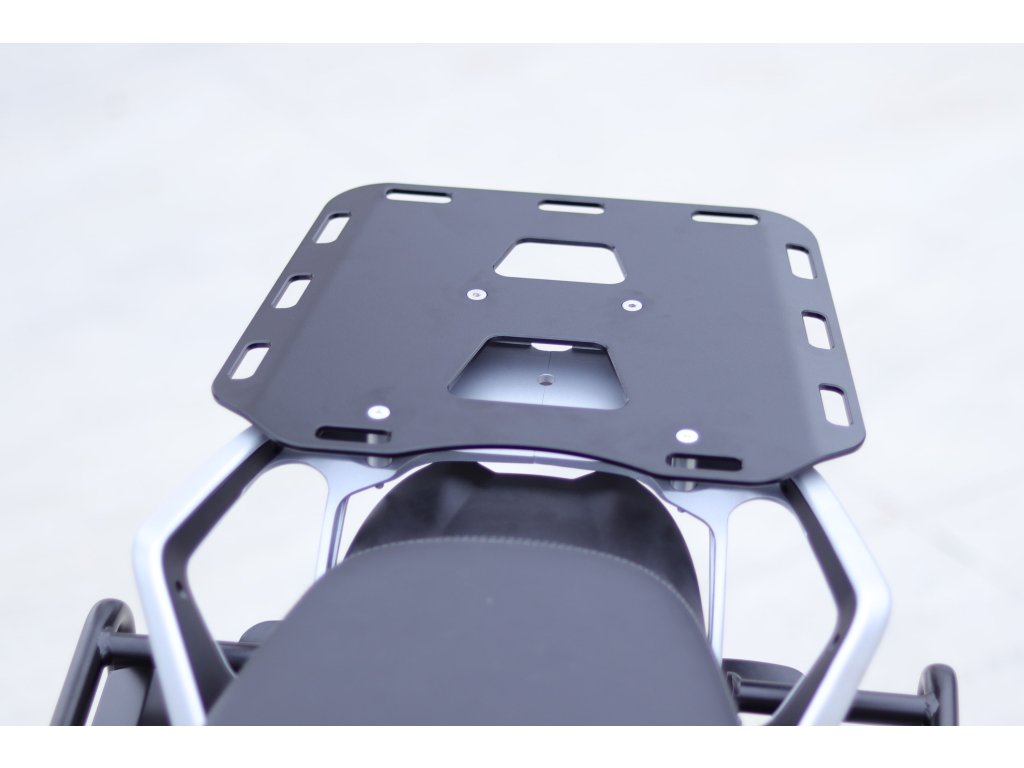 Szeroka aluminiowa płyta BUMOT do mocowania bagażu na Moto Guzzi V85TT. Dzięki otworom na obwodzie można na niej zamocować dowolne miękkie bagaże. Zaokrąglone rogi płyty zapobiegają uszkodzeniu pasków.