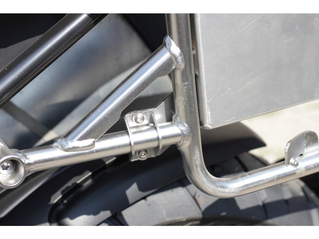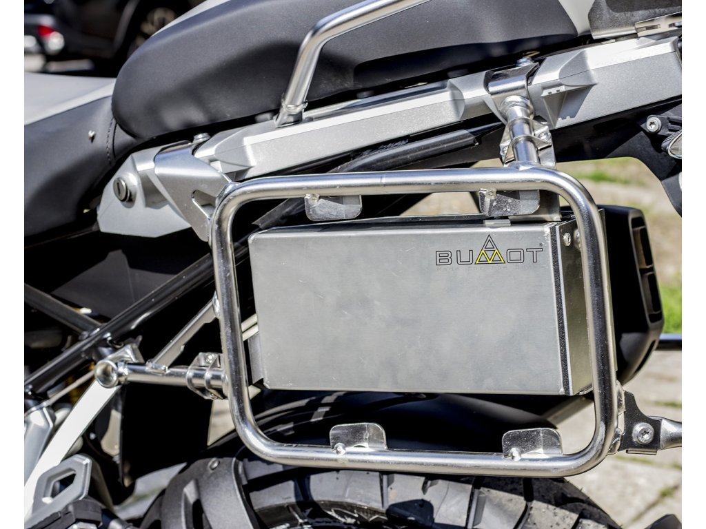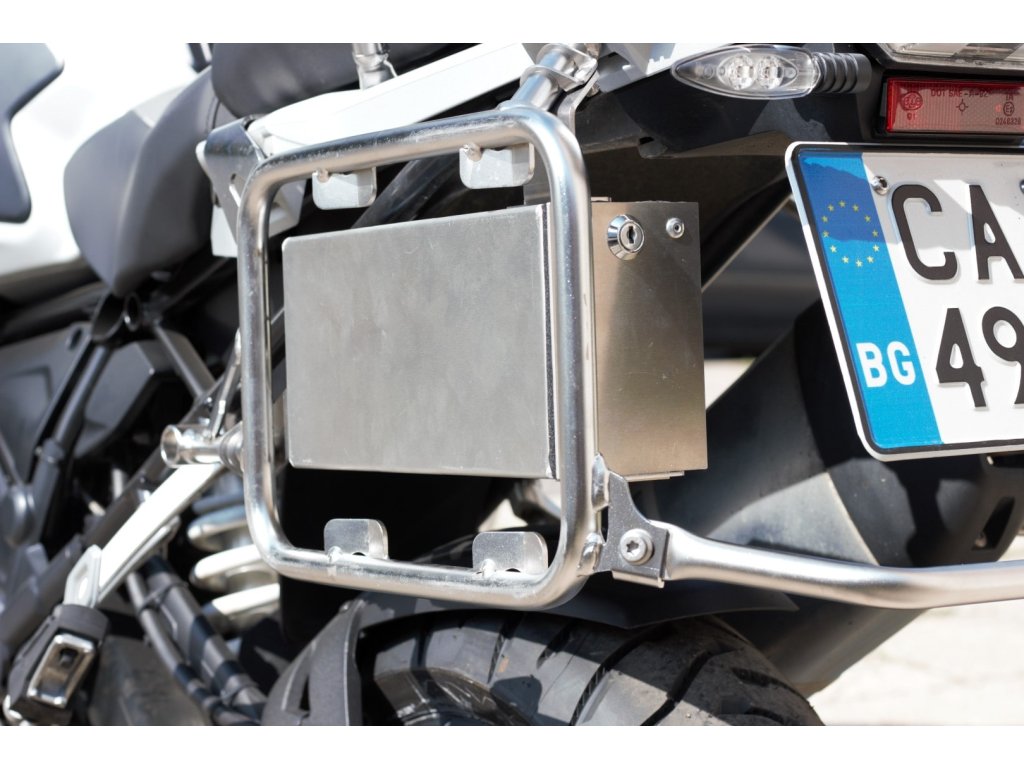 Masywna aluminiowa skrzynka na narzędzia, konstrukcja spawana z 2-milimetrowej stali aluminiowej, pyłoszczelna, pomalowana proszkowo. Do montażu na ramach kufrów BMW. Montaż na równym kufrze w kierunku motocykla, po przeciwnej stronie do rury wydechowej. Komplet z zamkiem.