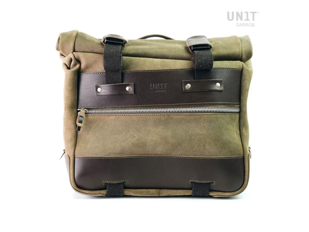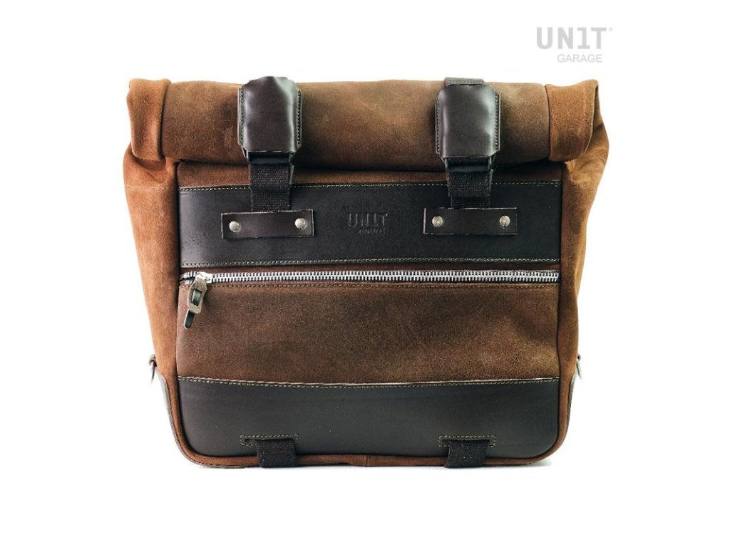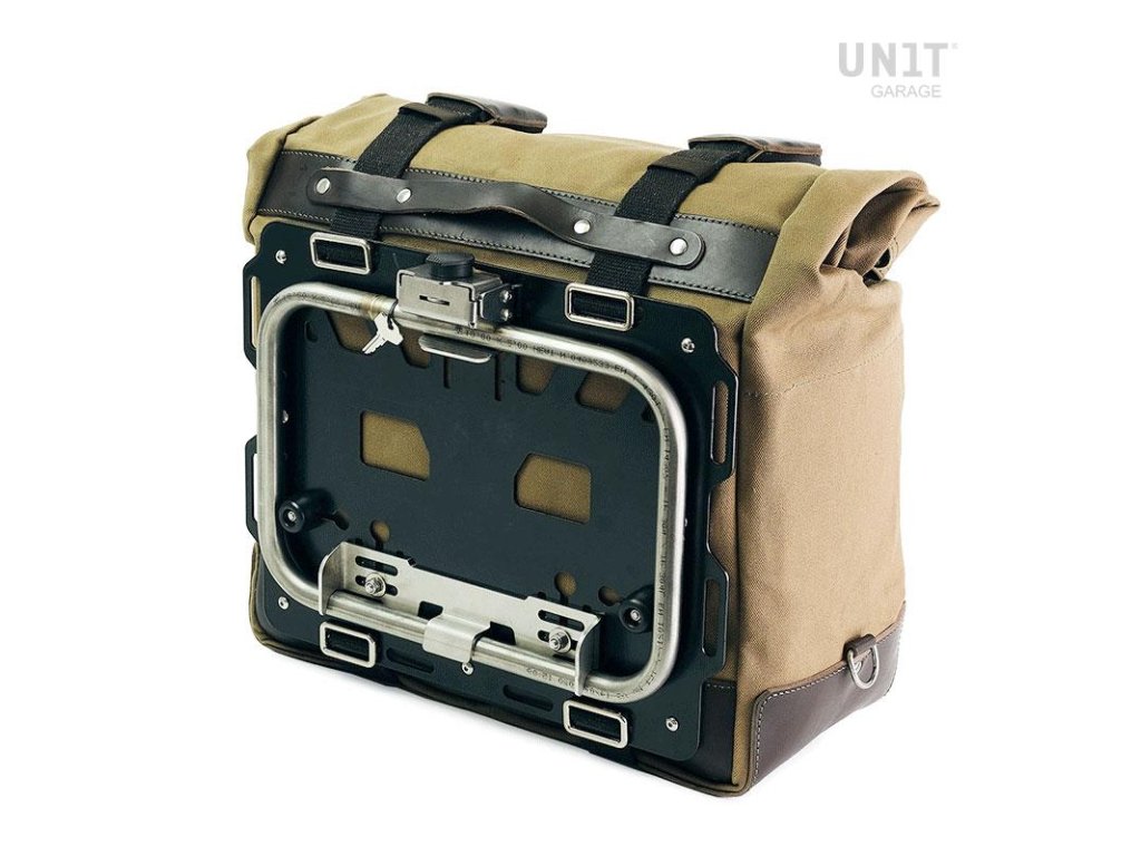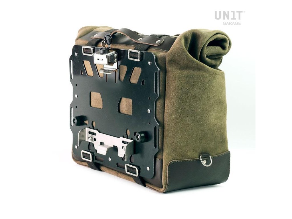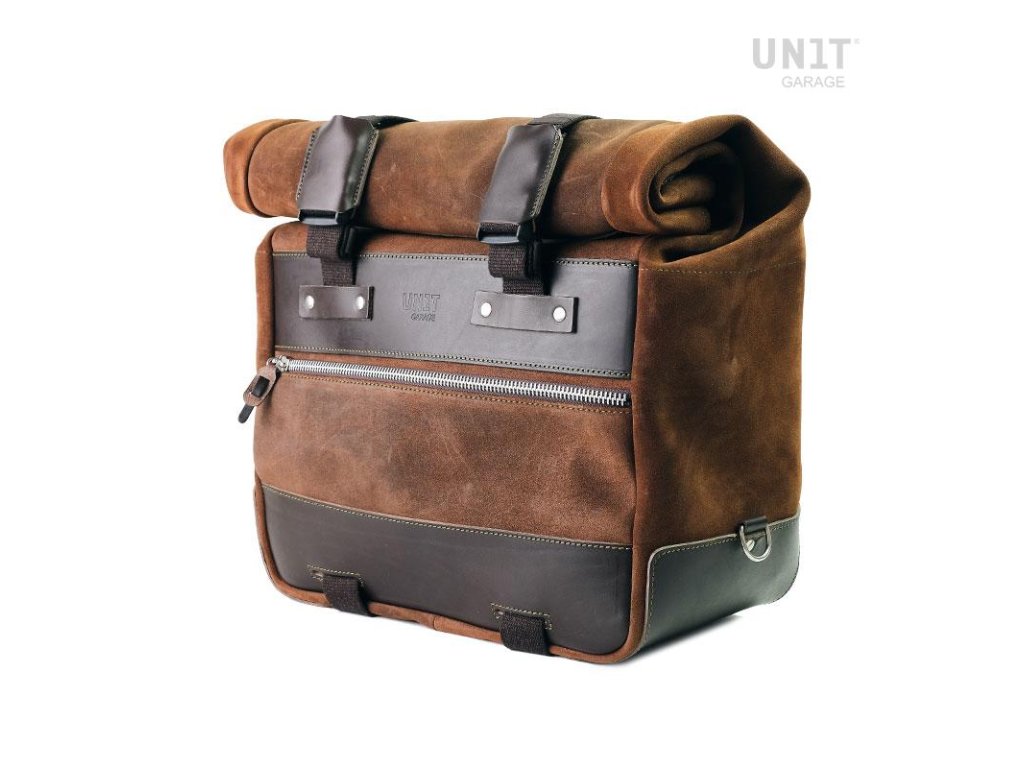 Brašna UNIT garage jest ręcznie wykonana we Włoszech z wytrzymałego woskowanego zamszu. Rolowany top można zamknąć prostą kłódką (brak w zestawie). Tył torby wyposażony jest w aluminiową płytę z systemem szybkiego montażu i zamkiem do łatwego przytwierdzenia do ramy motocykla. Torba ma wykończenia z 3 mm skóry oraz przesuwane osłony ukrywające plastikowe klamry. Z przodu znajduje się duża kieszeń na zamek.