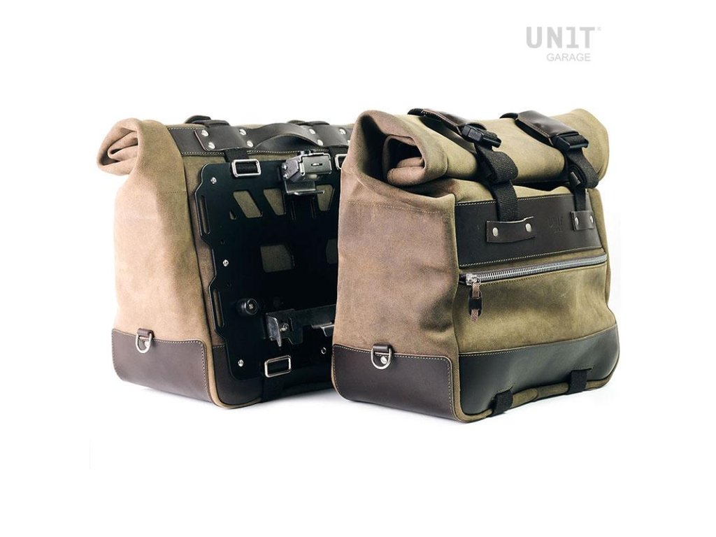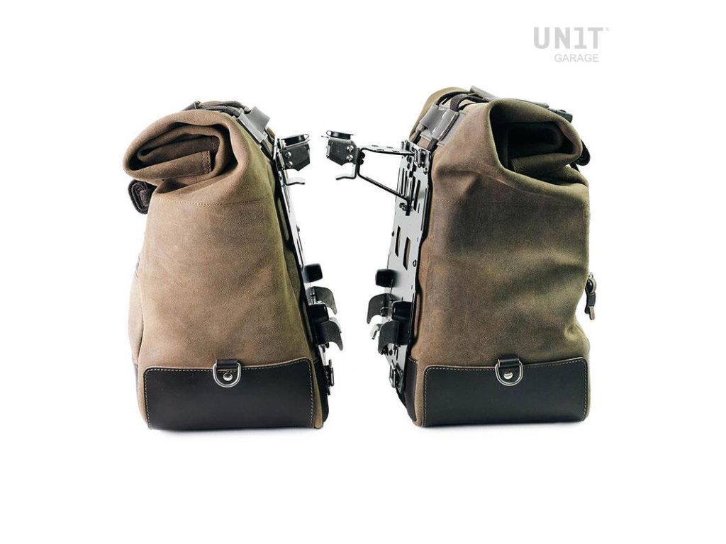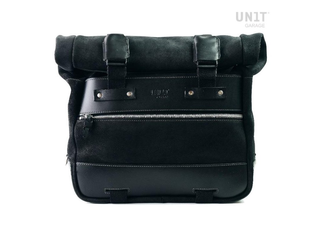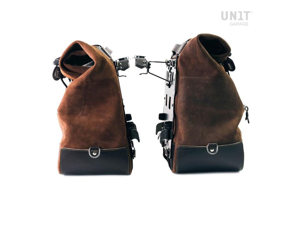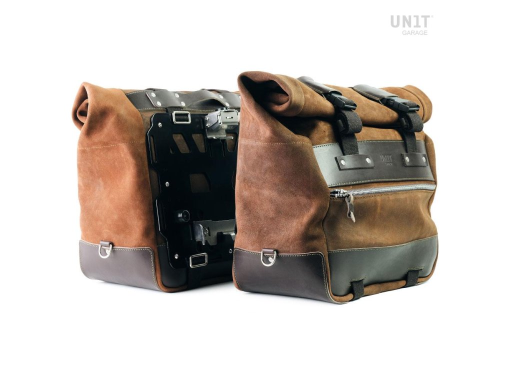 Brašna UNIT garage jest ręcznie wykonana we Włoszech z wytrzymałego woskowanego zamszu. Rolowany top można zamknąć prostą kłódką (brak w zestawie). Tył torby wyposażony jest w aluminiową płytę z systemem szybkiego montażu i zamkiem do łatwego przytwierdzenia do ramy motocykla. Torba ma wykończenia z 3 mm skóry oraz przesuwane osłony ukrywające plastikowe klamry. Z przodu znajduje się duża kieszeń na zamek.